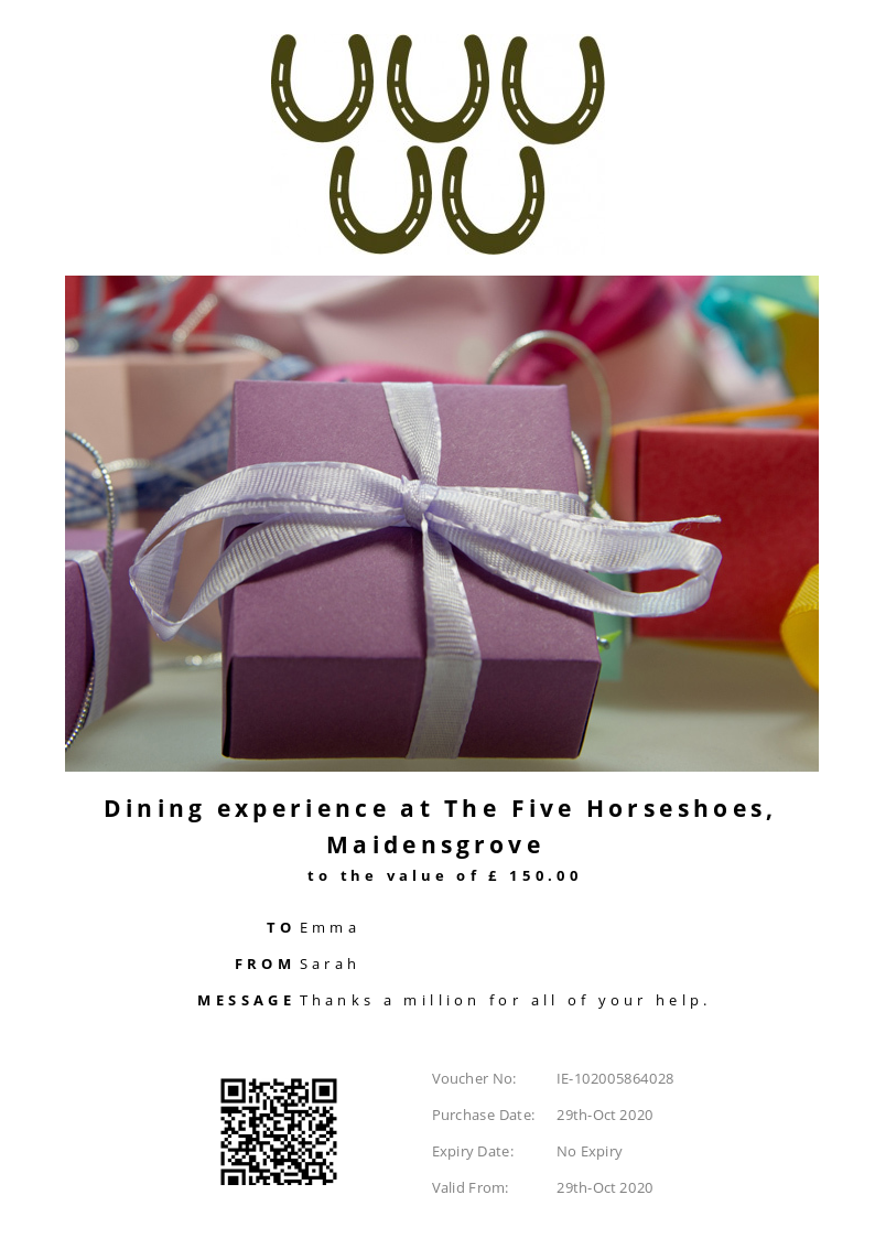 The Five Horseshoes allows you to purchase instantly printable gift vouchers, special offers and tickets using the Voucher Connect platform.